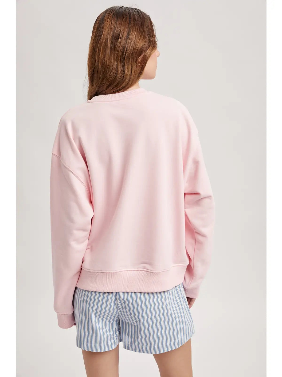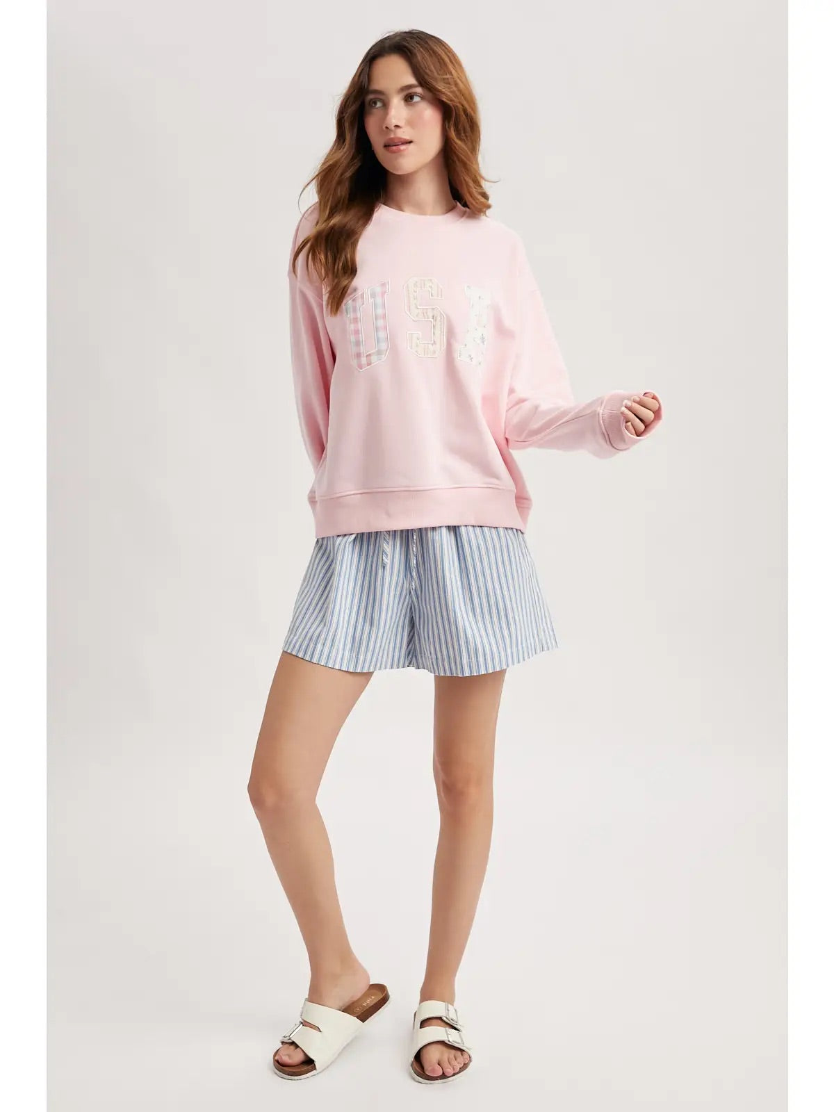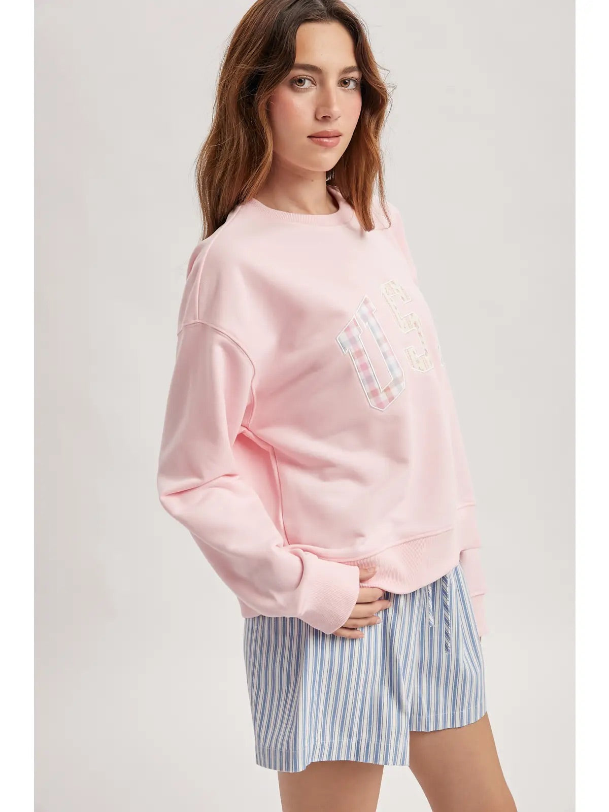 Show your style and spirit in this soft pink multi-print patchwork ‘USA’ pullover. A mix of bold patterns and soft knit comfort creates a unique, standout look perfect for casual days.