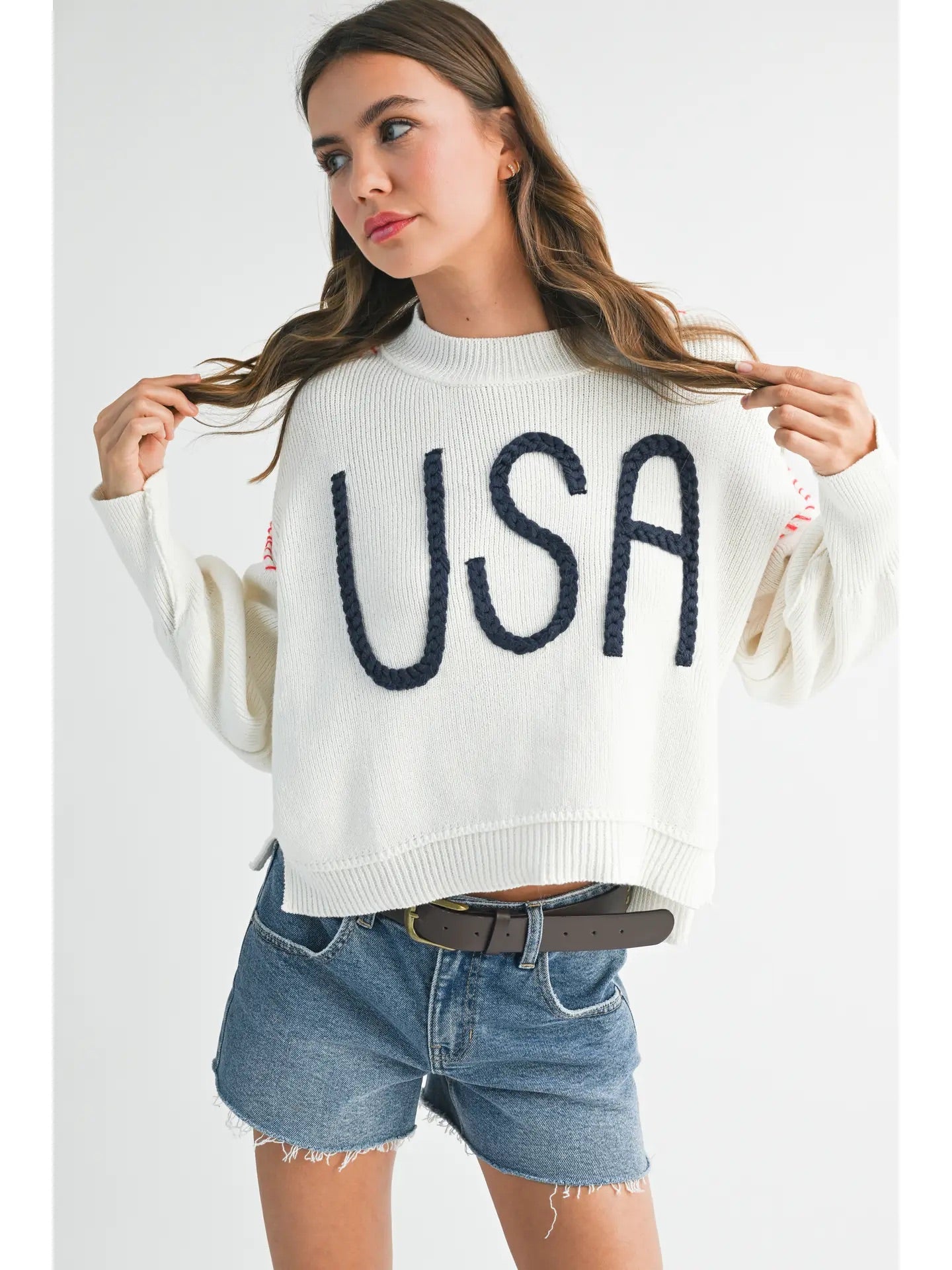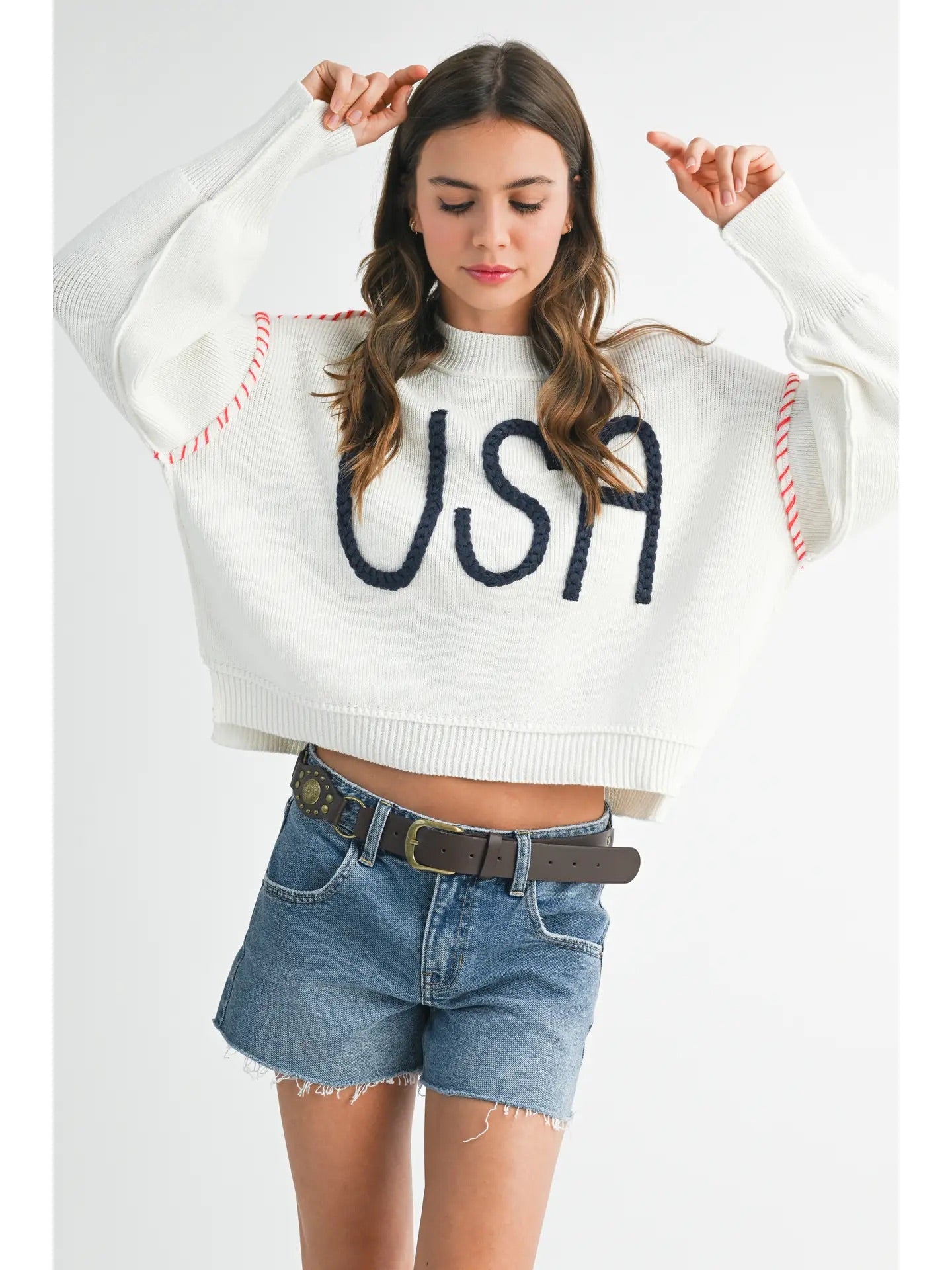 This beautiful USA Sweater exudes effortless cool with its ribbed fabric, cropped fit, oversized rope lettering, and contrast stitching. Perfect for a laid-back yet chic look.