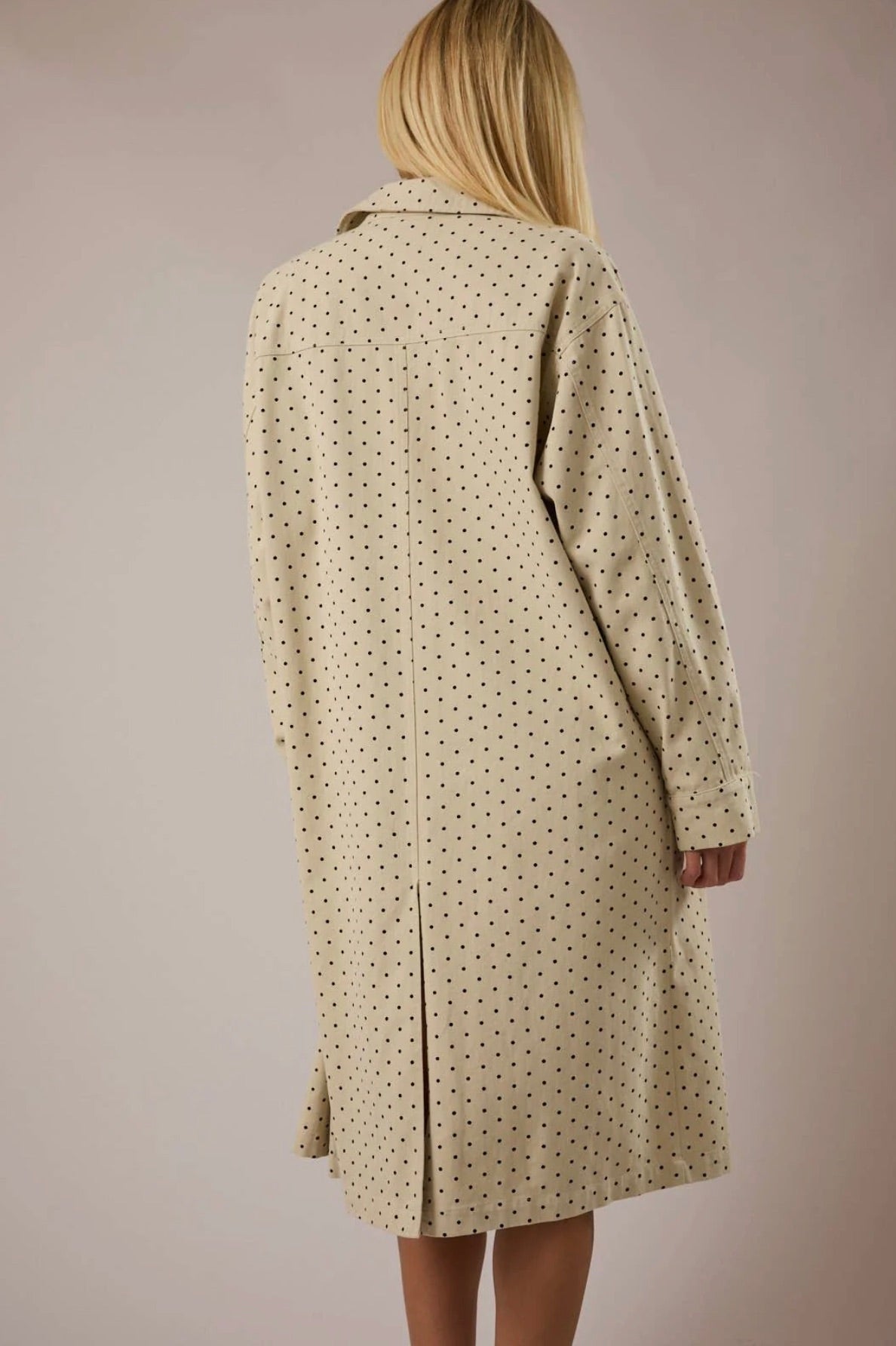 Add a playful twist to your outerwear with this polka dot denim trench coat. Designed in a lightweight denim that’s perfect for transitional weather, this piece layers effortlessly from cool mornings to breezy evenings. The oversized fit gives it that relaxed, borrowed-from-the-boys feel while still looking polished and put together. Finished with classic trench details and a fun allover polka dot print, this jacket makes a statement without trying too hard. Easy to throw on over basics, dresses, or matching sets, it’s the kind of standout layer your closet didn’t know it needed.
