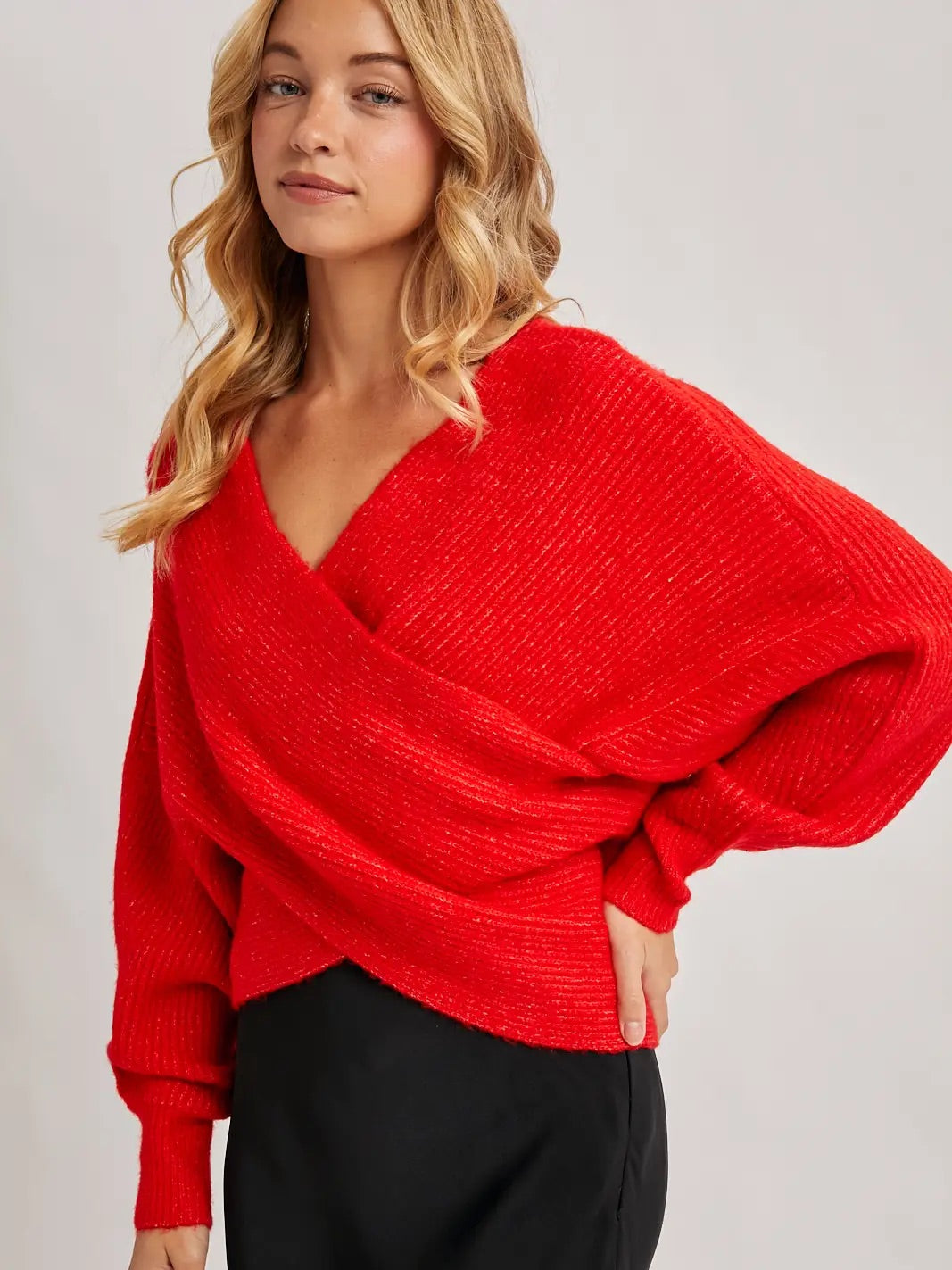 This effortlessly chic and cozy sweater, crafted from a soft and fuzzy knit is designed for both comfort and sophisticated style. It features an elegant surplice or wrap-front design that creates a flattering V-neckline, which is wide enough to be styled alluringly off the shoulder. The relaxed, slightly cropped silhouette is enhanced by voluminous dolman sleeves that taper into fitted ribbed cuffs, adding a touch of modern drama to this versatile and inviting piece.